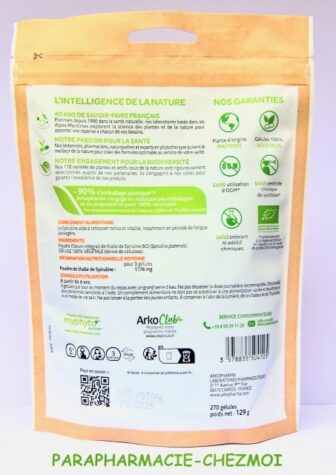 Arkogélules® Spiruline BIO est une formule exclusive, à base d’ARKOTOTUM® Intégral, permettant de restituer 100% des substances actives naturellement présentes dans la plante, qu’elles soient hydrophiles, lipophiles ou volatiles, ce qu’aucune méthode d’extraction ne peut saisir.