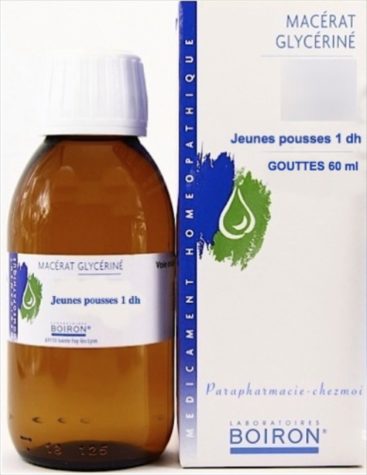 *Après cette macération, le macérat-mère de bourgeons ou de jeunes pousses est dilué 10 fois dans un mélange eau-alcool-glycérine pour obtenir le macérat glycériné 1DH.
