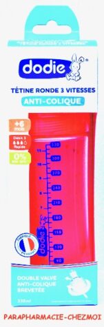 Le nouveau biberon Dodie ANTI-COLIQUE inclut une valve brevetée anti-colique, anti-régurgitation et anti-aérophagie.De plus il est ergonomique et possède un système anti-fuite.