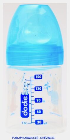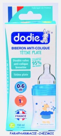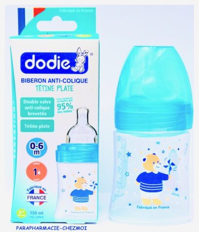 - Tétine double valve qui favorise une circulation d’air régulière dans le biberon et non dans le ventre de bébé.