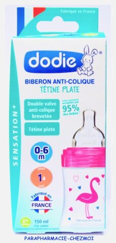 - Tétine double valve qui favorise une circulation d’air régulière dans le biberon et non dans le ventre de bébé.