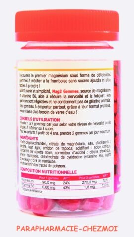 Fructo-oligosaccharides, citrate de magnésium, eau, stabilisants : pectine, agar agar, amidon de tapioca; acidifiant : acide citrique, concentré de carotte noire, correcteur d'acidité : citrate trisodique, arôme framboise, chlorhydrate de pyridoxine (vitamine B6), agent d'enrobage : cire de carnauba.