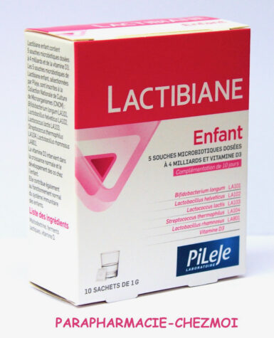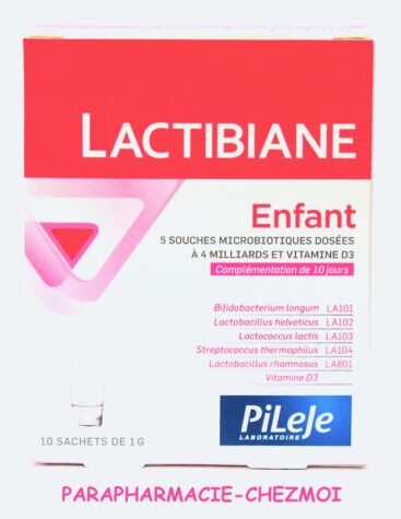 Lactibiane Enfant est un complément alimentaire destiné à apporter aux enfants cinq souches microbiotiques spécifiques, dosées à 4 milliards par sachet, ainsi que de la vitamine D3.