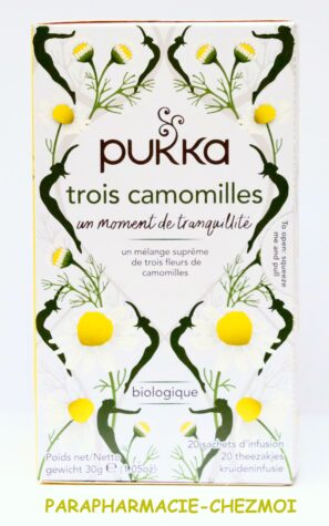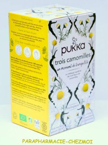 PUKKA INFUSION TROIS CAMOMILLES BIOLOGIQUE associe trois camomilles :Fleur de camomille africaine BIO, fleur de camomille égyptienne BIO, fleur de camomille européenne BIO.