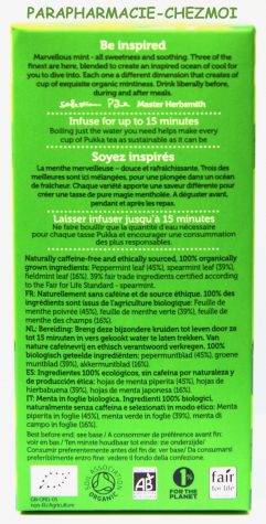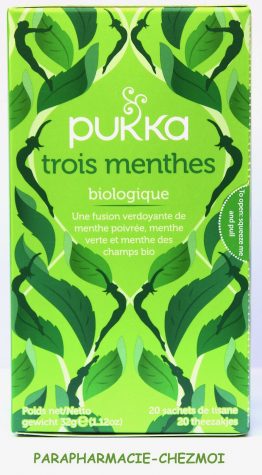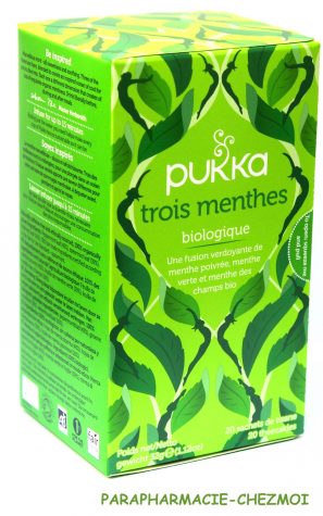 PUKKA TISANE TROIS MENTHES BIOLOGIQUE associe des feuille de menthe poivrée BIO, des feuilles de menthe verte BIO, et des feuille de menthe des champs BIO.
