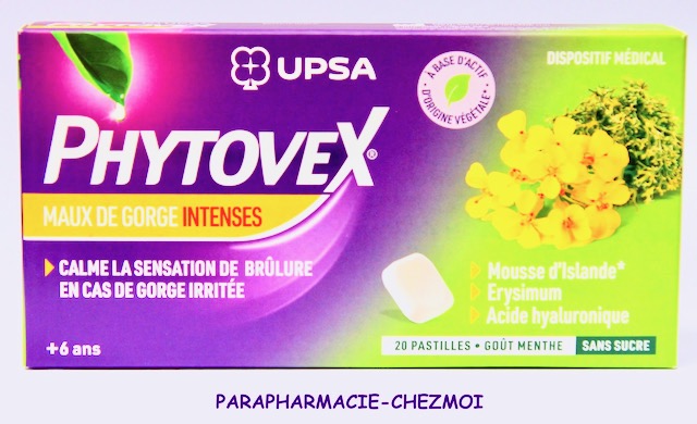 UPSA Phytovex maux de gorge intenses est un dispositif médical, destiné à soulager  la gorge irritée ainsi que la toux qu'elle soit sèche, grasse, irritative ou allergique.