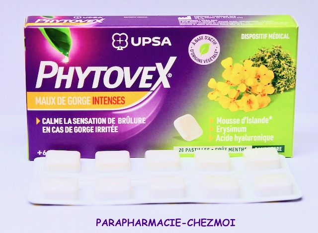 Les pastilles UPSA Phytovex maux de gorge intenses forme un film muco-adhésif protecteur qui exerce une action apaisante rapide sur les voies respiratoires supérieures.