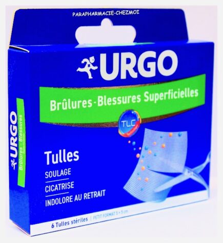Si nécessaire découper le tulle au format souhaité en utilisant des ciseaux propres et désinfectés, puis le recouvrir d’un pansement secondaire de type compresse stérile URGO maintenue par une bande extensible de type Nylexfix ou un sparadrap de type Urgopore®.